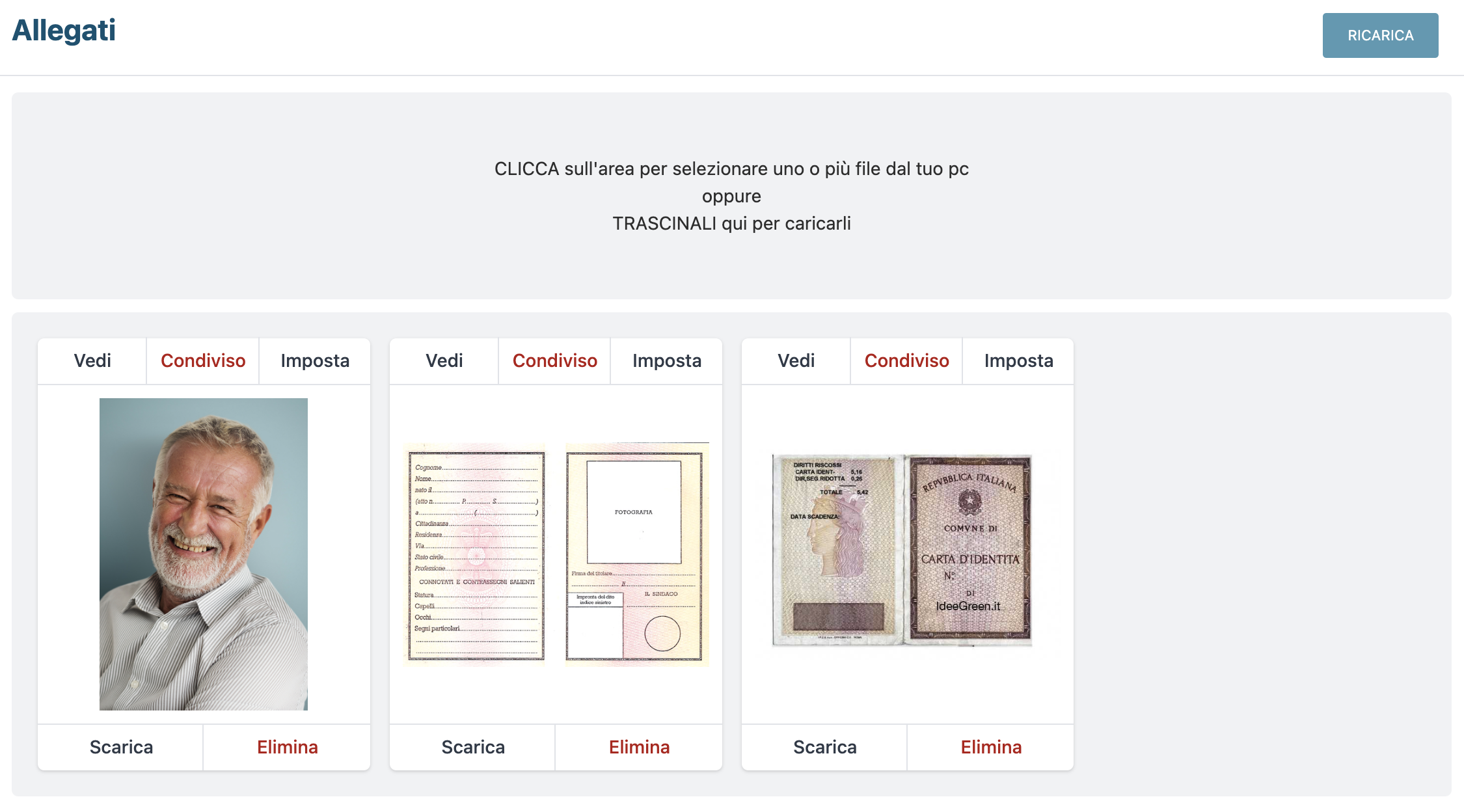 Aggiungi tutti i documenti che vuoi allegare e, una volta terminato, clicca sul bottone Upload. Le foto e i file verranno caricati nella sezione Allegati del defunto.