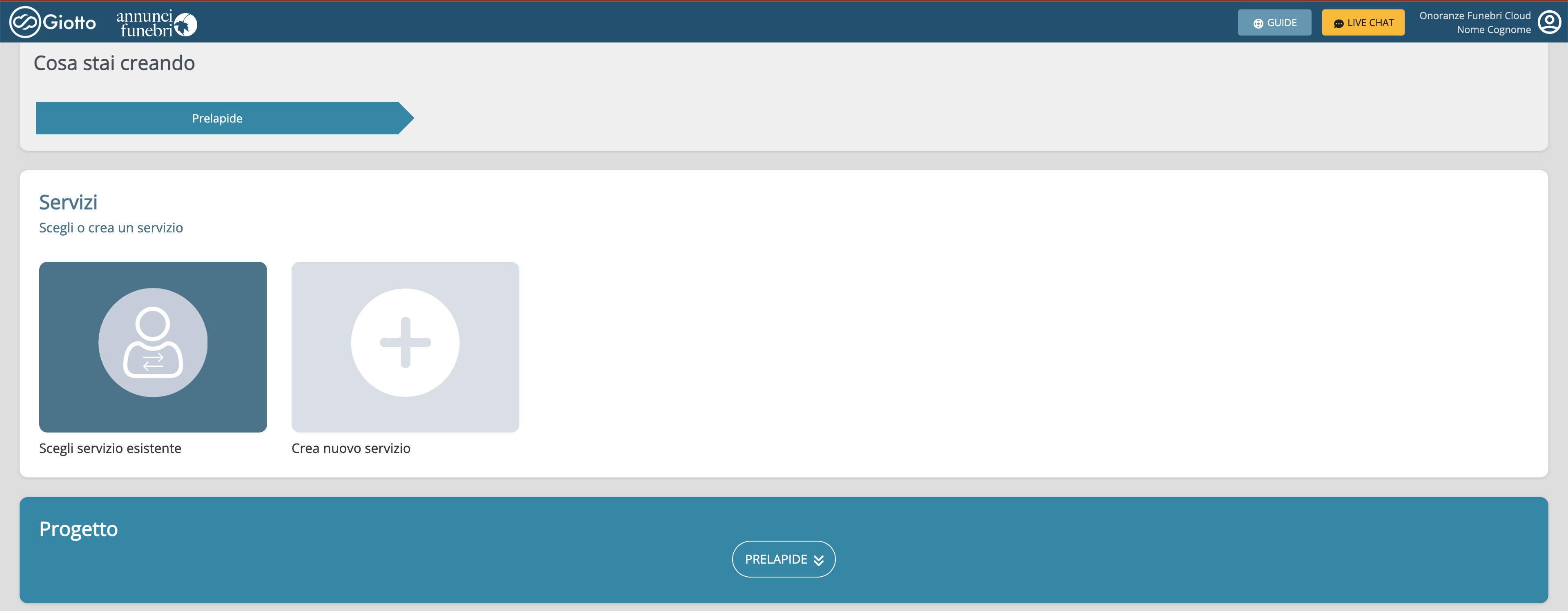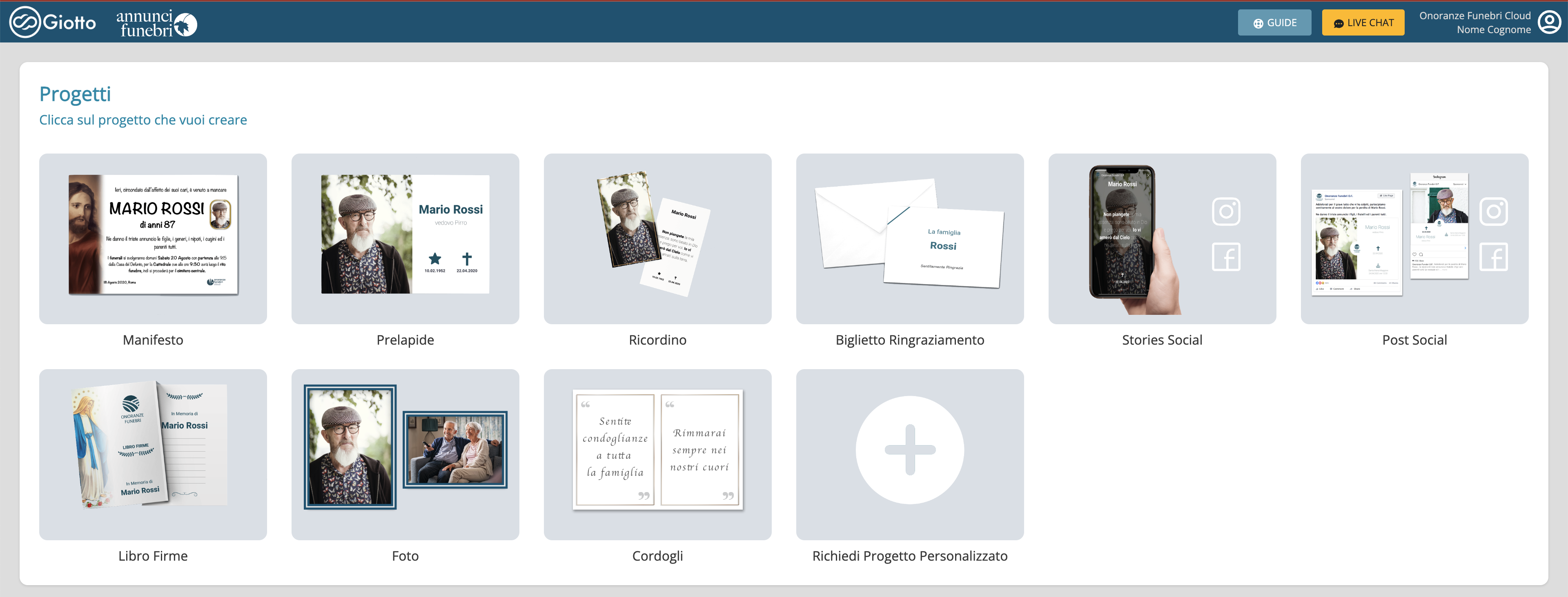 Dalla pagina iniziale di Giotto selezionare un Progetto tra quelli presenti cliccandoci sopra. (Manifesto, Prelapide, Ricordino, Biglietto Ringraziamento, Stories Social, ecc...)
