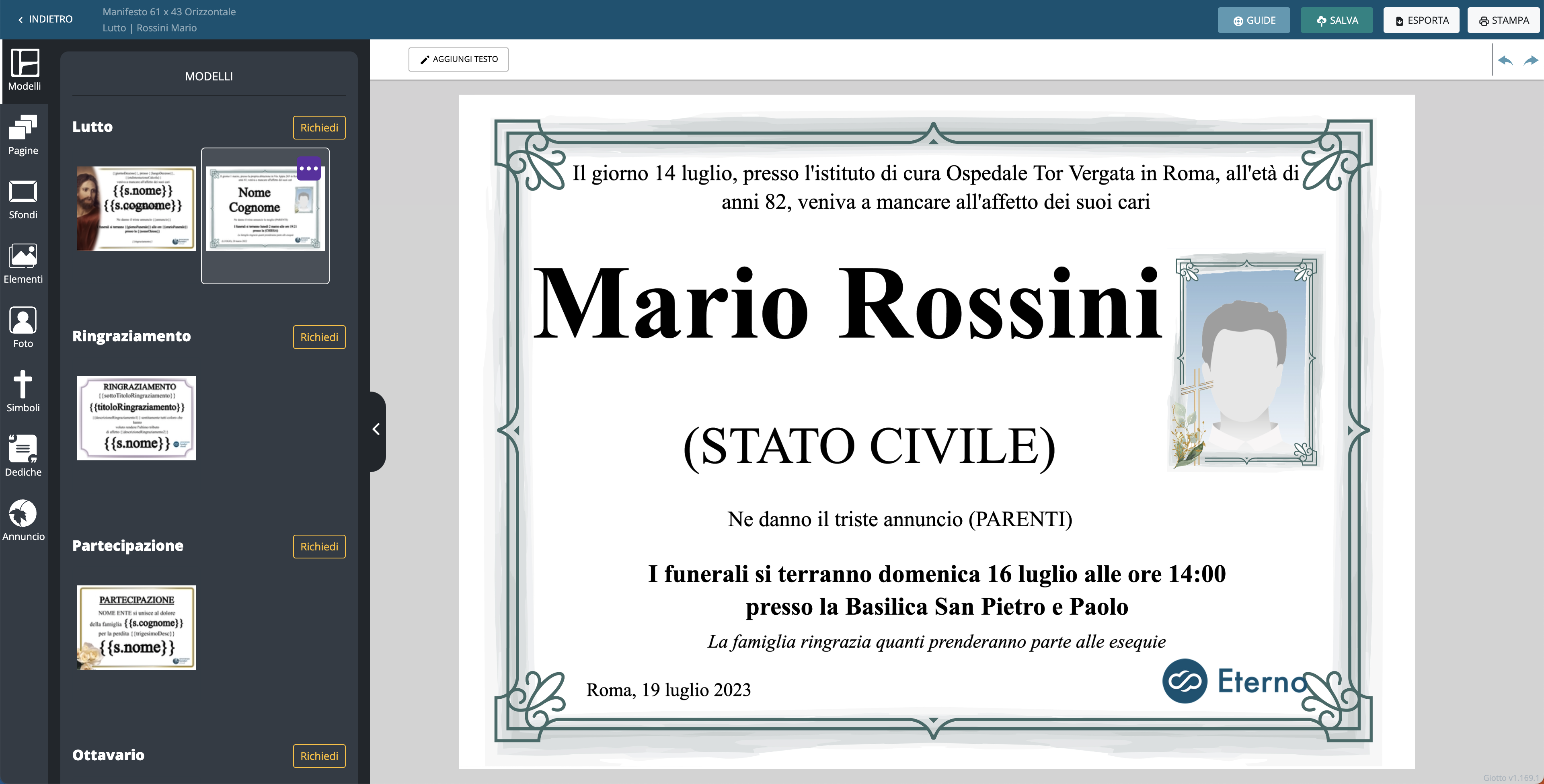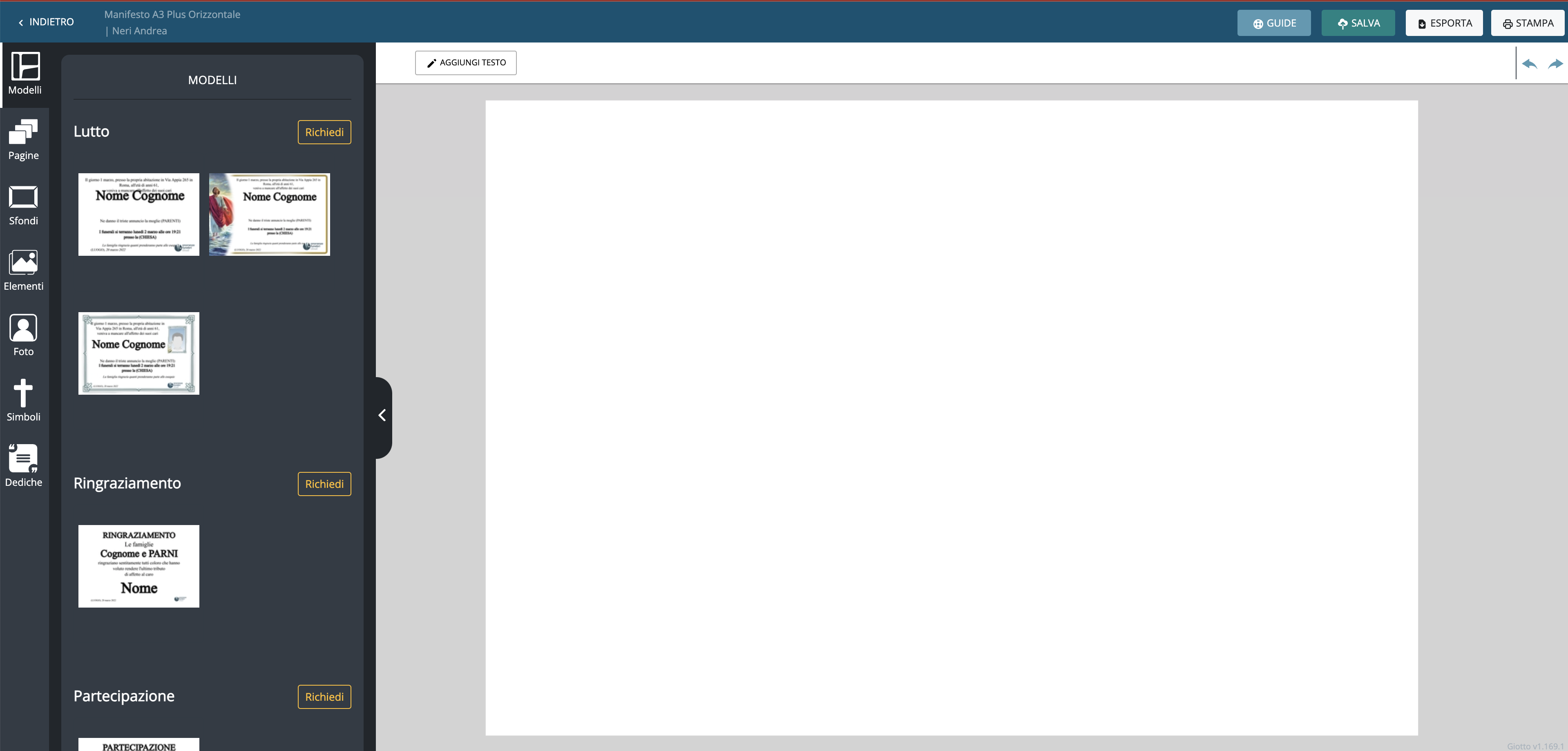Per creare un progetto di un Manifesto, devi sempre selezionare un modello di partenza (Lutto, Ringraziamento, Partecipazione, Ottavario, Trigesimo ed Anniversario). In questo modo tutti i progetti che vai a creare per ogni defunto saranno sempre visibili nella scheda del servizio su Eterno come storico.