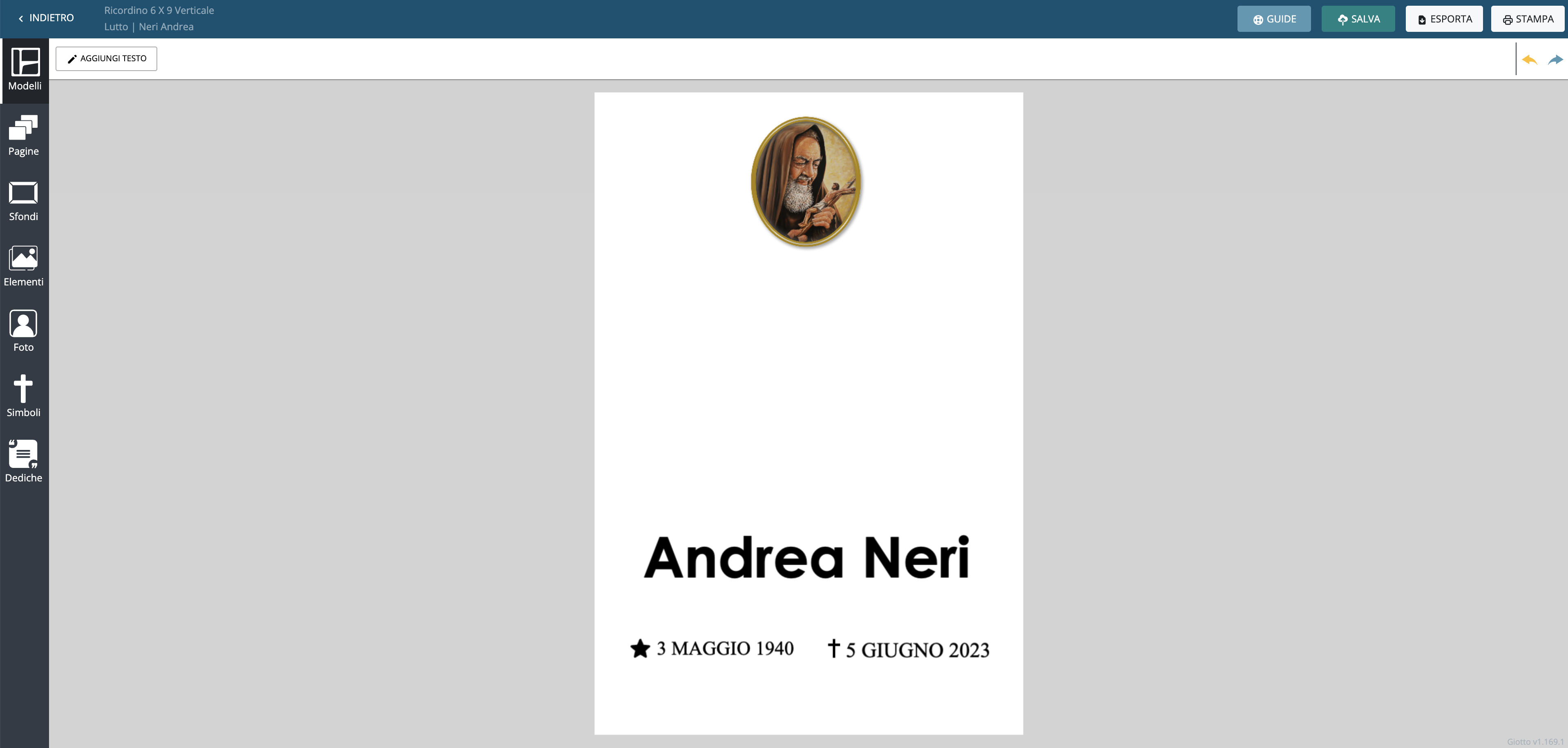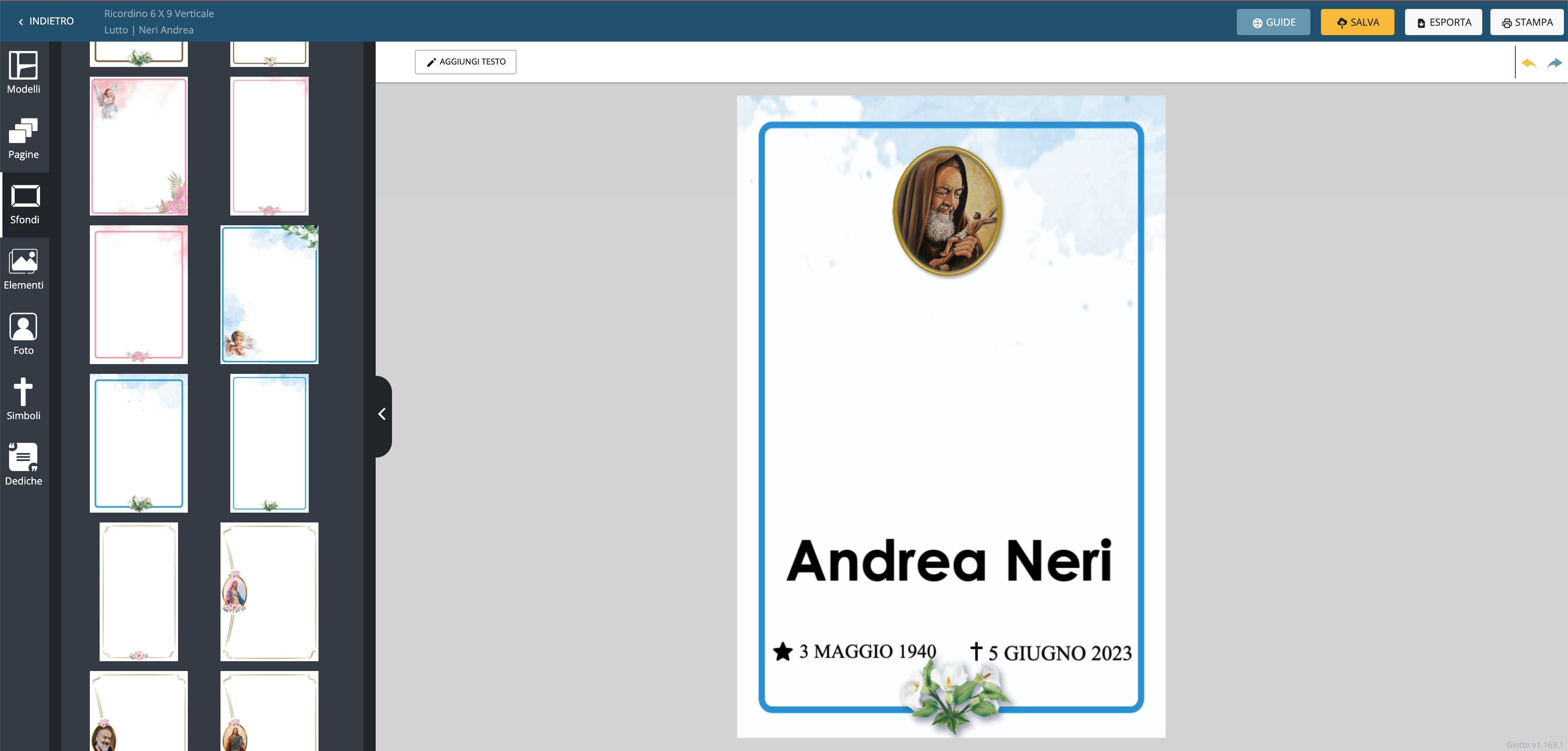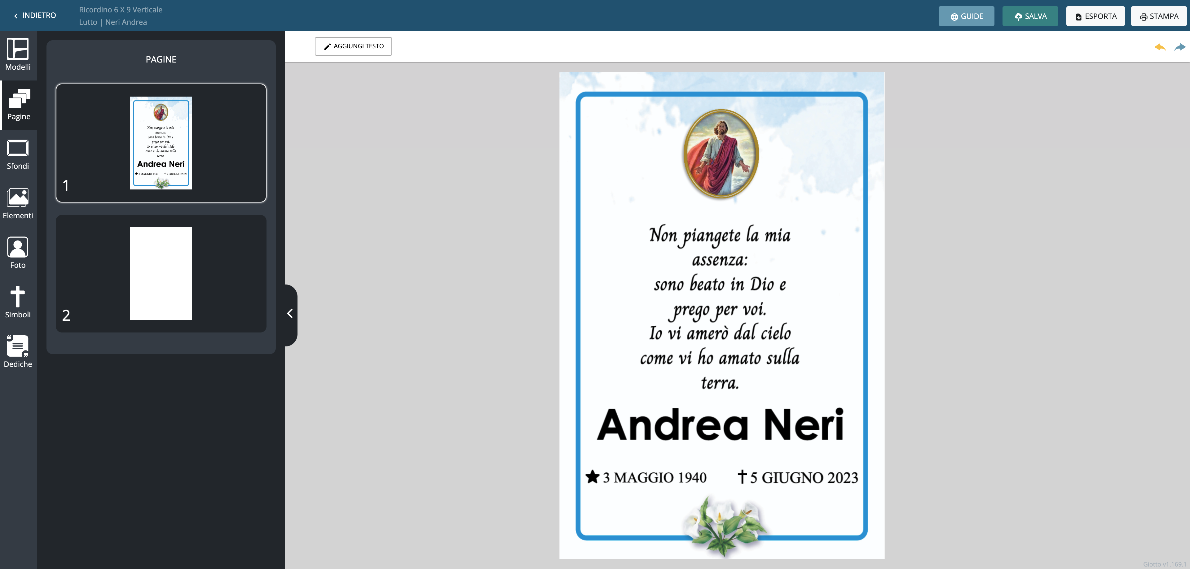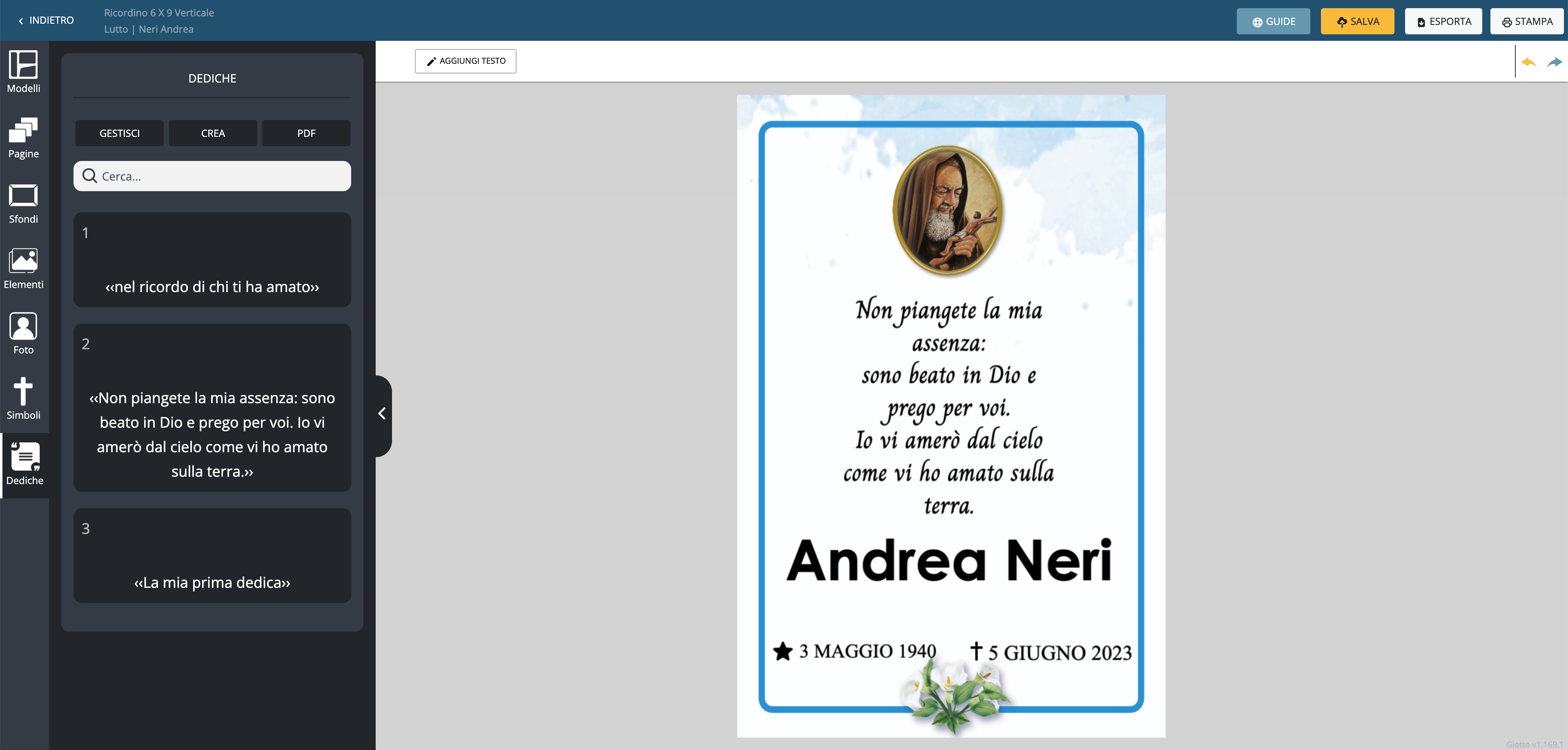 Le scritte autocompilate come Nome, Cognome, Data di nascita e Data del decesso compariranno all'interno del ricordino.