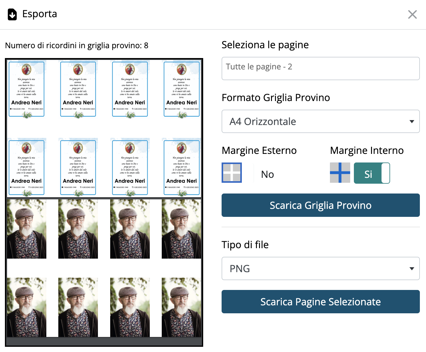 Clicca su ESPORTA in alto a destra per aprire visualizzare la griglia provino.