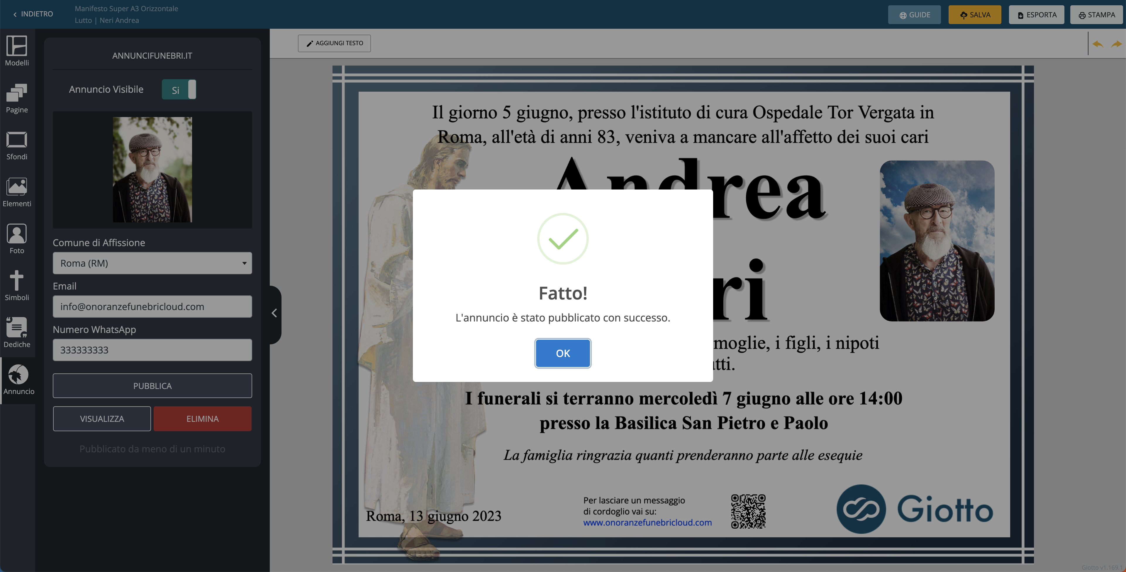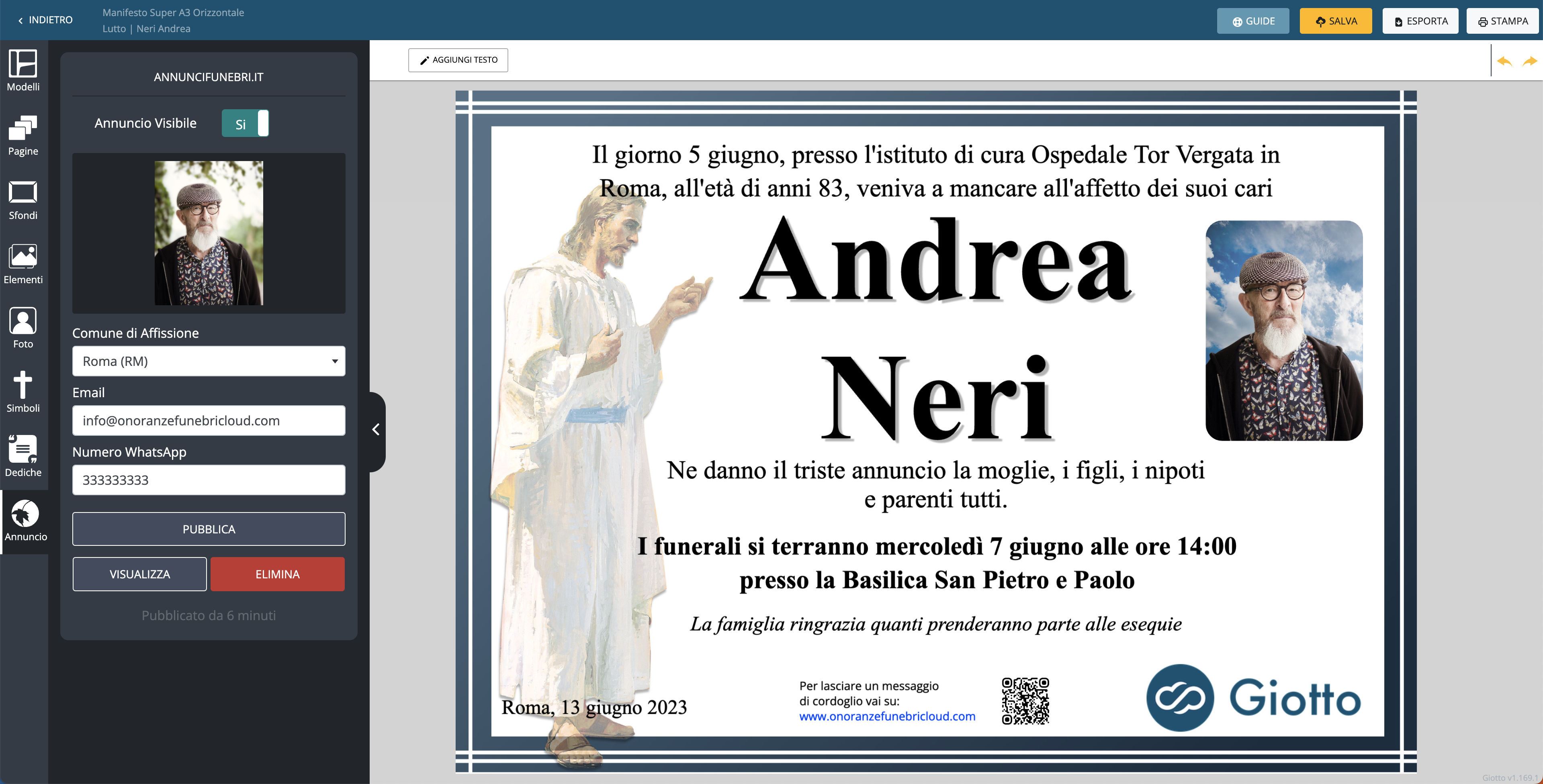 Da Giotto, crea un nuovo manifesto di Lutto oppure riprendine uno già creato.
