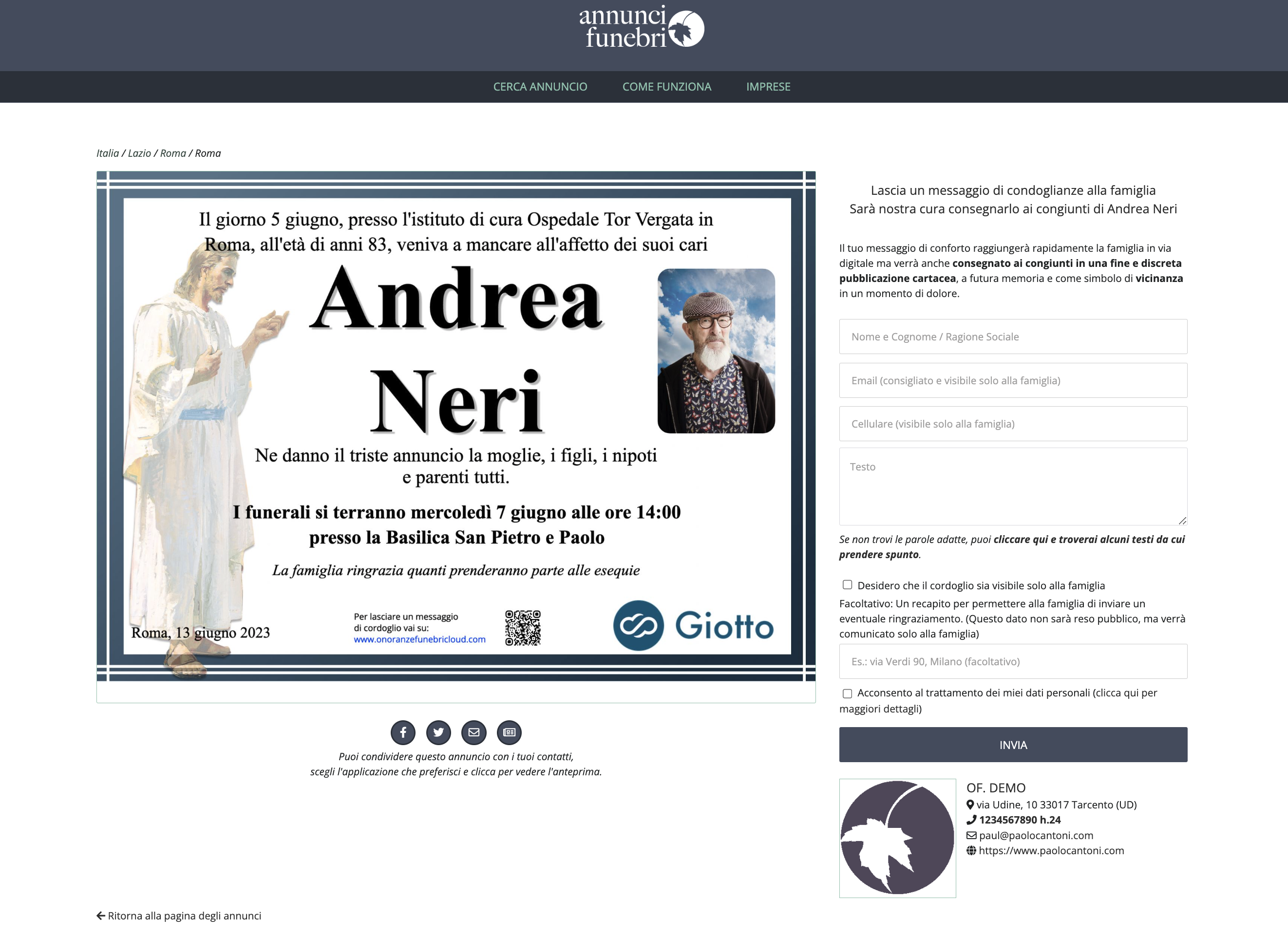 L'annuncio verrà pubblicato sul tuo sito e ti verrà inviato un sms contenente il link del necrologio da inviare al familiare.